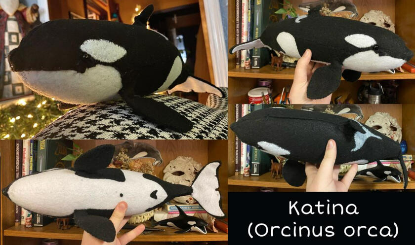 A medium-sized plushie of a real killer whale known as Katina. For all plushies, resemblance to the provided reference material is prioritized. In this case, photo references of Katina were used to ensure that all of her physical characteristics (such as the shape of her face and dorsal fin), scars, and coloration details were accounted for (~$100 USD).